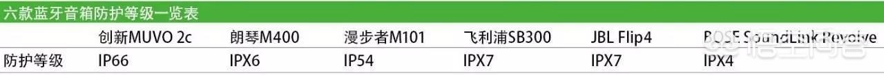 在表格中我们看到的IP等级有两个数字,后者代表其防水性,这也是大多数蓝牙音箱在宣传其防护性时重点强调的,而前者则代表防尘性。数字越大代表其防护等级越高,可能你注意到了,在这六款产品中,不少产品在防尘性这一位置显示的是“X”,这意味着产品在防尘性上不属于IP规定的任何情况。这里有两种可能:一种是厂商自行规定了防尘标准,这样做的厂商很少;另一种是厂商没有提供任何防尘能力,只提供了防水能力,X只是个“占位符”。相信此次体验中的产品应该都是属于后一种情况。