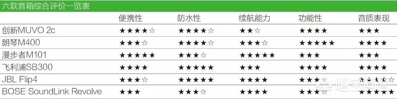 六款蓝牙音箱在户外属性上各有千秋,所适合的细分应用也存在一些不同。我根据它们的具体表现,以及其在规格参数上所呈现的内容,从便携性、防水性、续航能力、功能性以及音质表现这五个方面,给出具体的星级评价,便于读者直观地了解它们在这五个方面所处于的水平,满分为五颗星★,☆代表半颗星。
